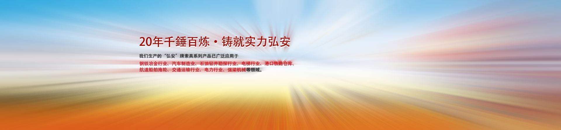 公司生產的“弘安” 牌索具系列產品已廣泛應用于鋼鐵冶金行業 、 汽車制造業 、石油鉆井勘探行業 、電梯行業 、港口鐵路倉庫 、航道船舶拖輪 、交通運輸行業 、電力行業 、 強梁機械 等領域。